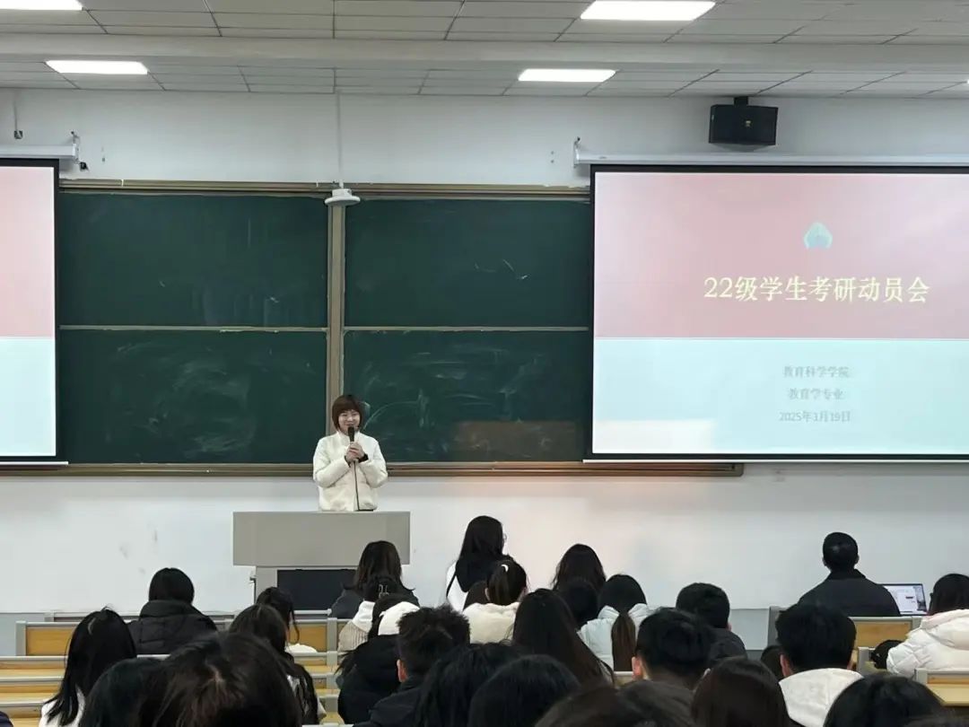 本次考研动员大会于2025年3月19日在第二教学楼113热烈召开,大会由教育学教研室主任董衍美老师主持,yl6776永利集团的教学副院长高辉老师、科研副院长倪丹老师、教育心理系主任王伟老师、教育学教研室教师袁琳老师和邰晶怡老师、辅导员孔灵昕老师以及22届教育学专业的同学们积极参与,共同见证了这一鼓舞人心的时刻。