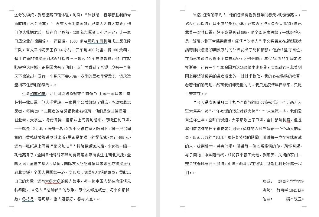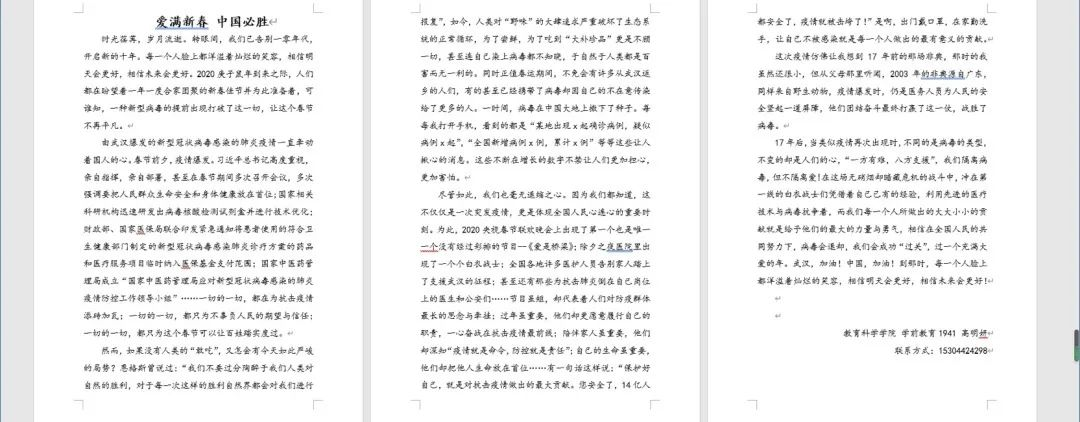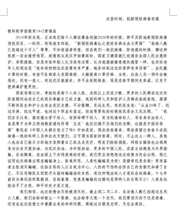非常荣幸我能够获得此次寒假征文活动的一等奖,衷心地感谢学校老师和同学们对我本篇文章的支持和喜爱。“人心齐,泰山移。”我国疫情已转向好态势,感谢冲在抗疫一线的医生,感谢为疫情做出贡献的人们。我想向你们道一句:辛苦了。春天来了,我们离胜利不远了。再次感谢学校给予的奖励,我的内心激动不已,我会继续努力,为我教科院争光!