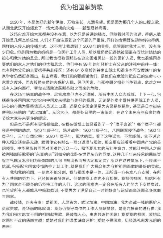 首先非常开心我能有一个平台把自己想说的话,对医护人员和对国家的祝愿,以文字的形式表达出来,并得到大家的肯定。