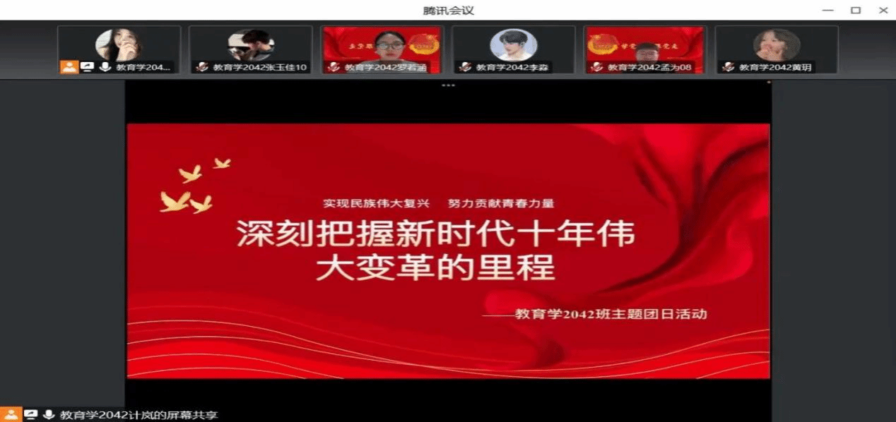 十年奋进,书写彪炳史册的时代答卷,十年跨越,成就气贯长虹的恢弘史诗。为全面贯彻党的二十大精神,坚定理想信念,高举中国特色社会主义旗帜,教育学2042班团支部于2022年11月29日晚以腾讯会议形式开展了“深刻把握新时代十年伟大变革的里程”主题团日活动。
