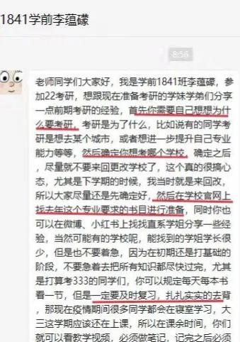 针对同学们提出的静不下心、内卷焦虑、学习低效等问题,学前教育2053班程真结合自身经历讲述了平和心态的重要性,分享了“学习不是起早贪黑就有效果,关键是要用心”的学习心得以及英语和专业课复习的方式方法,鼓励同学们按部就班也会伟大,慢慢求进步。