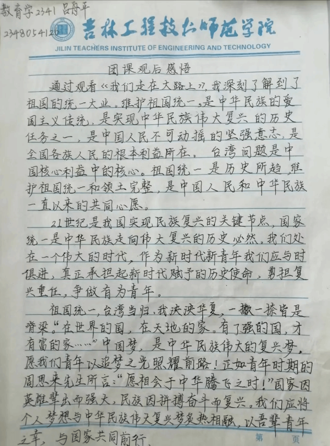 祖国统一,台湾当归,我泱泱华夏,一撇一捺皆是脊梁。“在世界的国,在天地的家。有了强的国,才有富的家……”中国梦,是中华民族的伟大复兴梦。愿我们青年以追梦之光照耀前路!正如青年时期的周恩来先生所言:“愿相会于中华腾飞之时!”国家因英雄辈出而强大,民族因拼搏奋斗而复兴。我们应将个人梦想与中华民族伟大复兴梦炙热相融,以吾辈青年之幸,与国家共同前行。