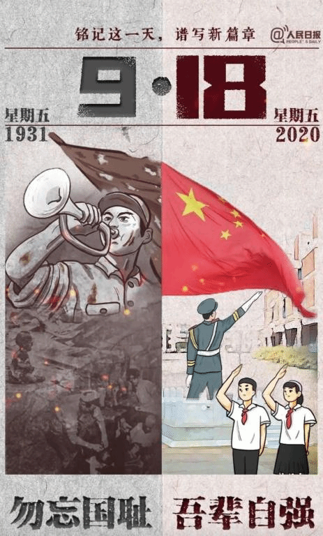 历史铭记,山河永刻 来源:学生两会 2020/09/18 今天是9月18日, 每一个中国人都应该铭记这一天。 89年的今天, 日本悍然发动侵华战争, “九一八事变”彻底爆发。 14年间,大片国土沦陷,3500万同胞伤亡。鲜血与抗争写就的历史警示我们:落后就要挨打,发展才能强大。 如今,一个充满生机的中国,已经巍然屹立在世界的东方。但,时间可以过去,鲜血的印记不能忘却!我们噙着泪花的眼中,深情凝视着这片土地。愿,战争的硝烟不再弥漫!勿忘国耻,警钟长鸣。铭记历史,吾辈自强!
