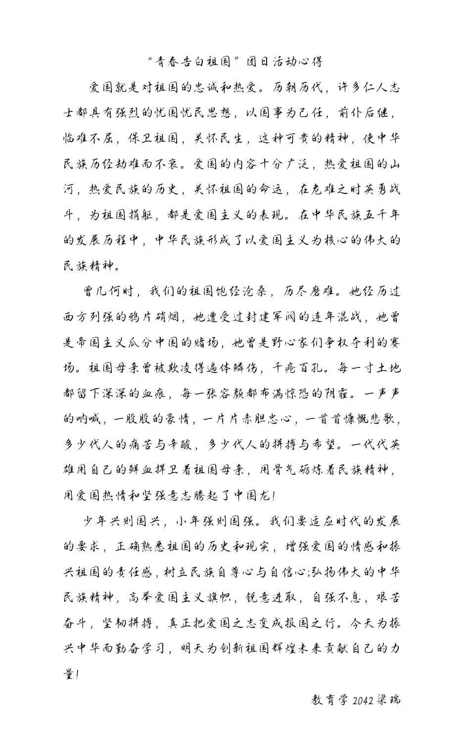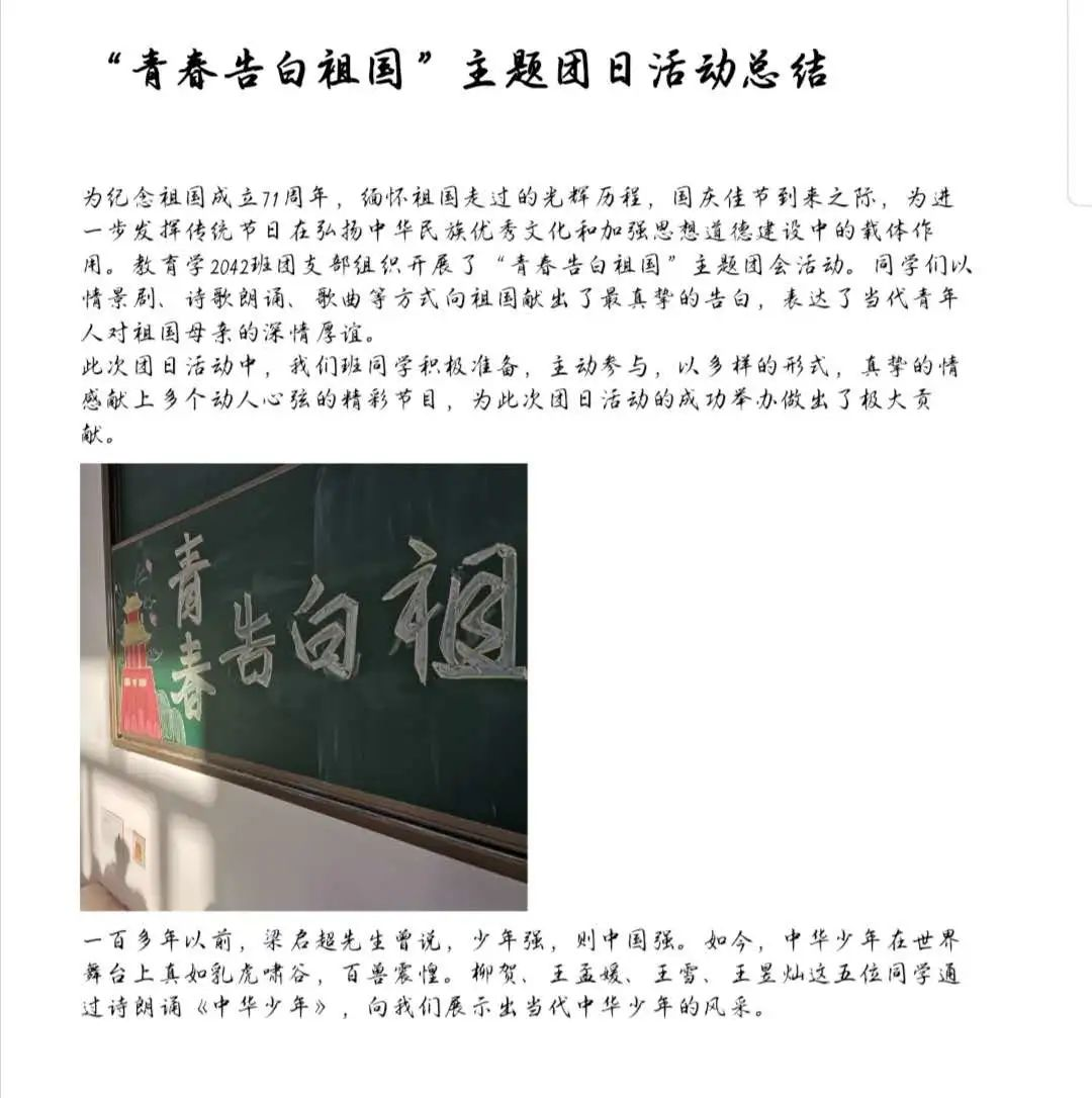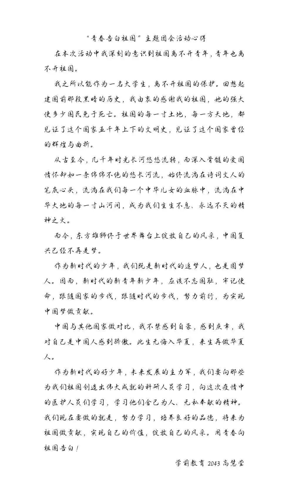 学前2041班的同学在开完班会后,对这一团日活动做出了总结,照片与文字的结合,是对祖国的爱