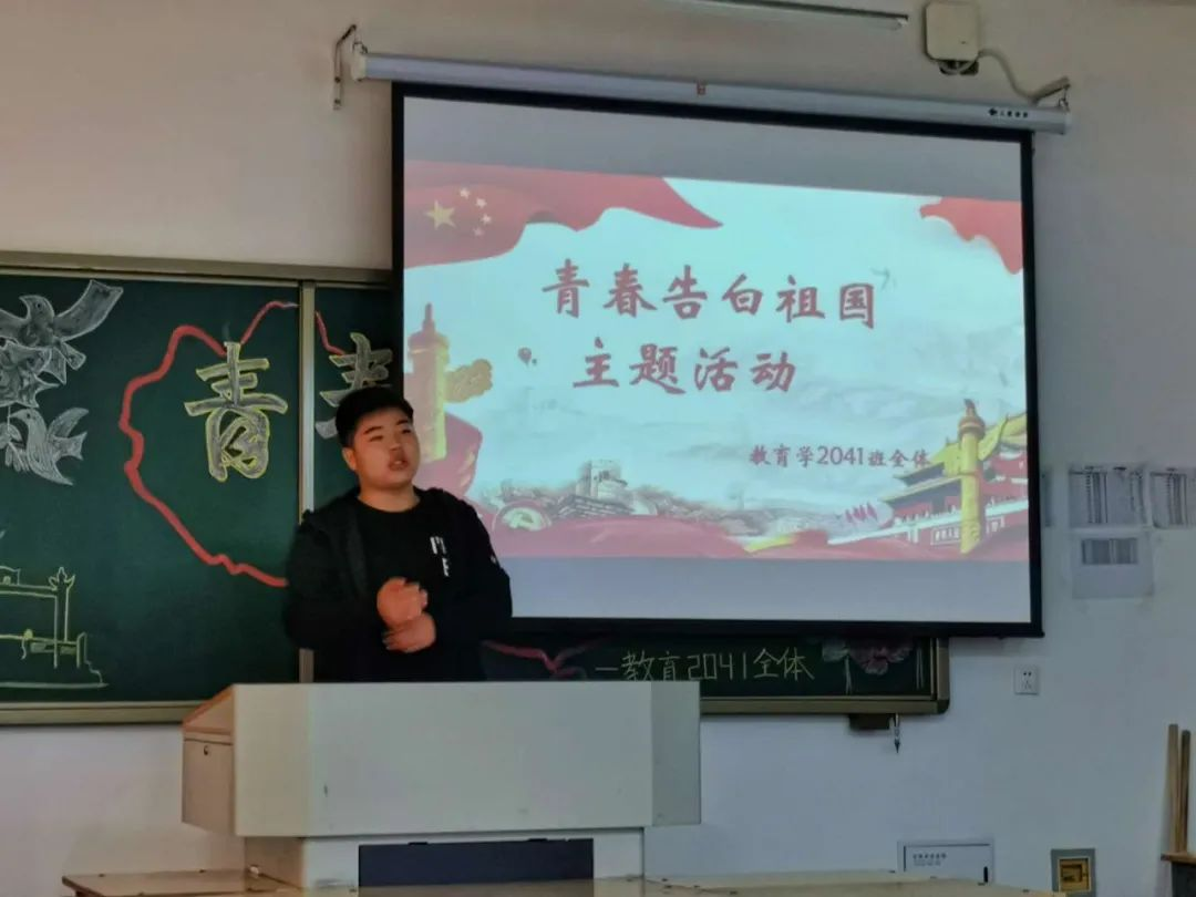教育2041班班长正在向班里的同学介绍祖国的发展历程,