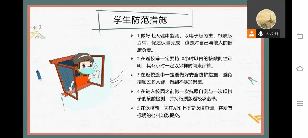 就目前形势而言,全国疫情处于多点散落式爆发、吉林省周边疫情形势不断变化,防控难度不断增加。为推进学院返校工作的开展,新生班会上,张柏羽老师就返校问题做出了以下几点提示: