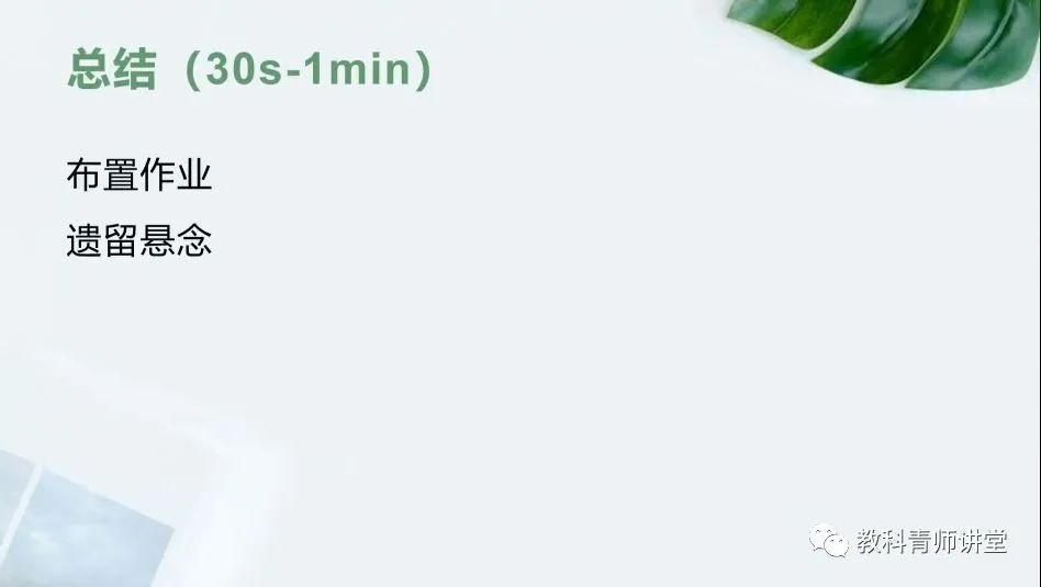 课堂总结可以分为两种:布置作业和遗留悬念。通过布置作业,可以让学习者对于上课所学的内容进行更加深入的思考;遗留悬念也能够激发学生的学习兴趣。