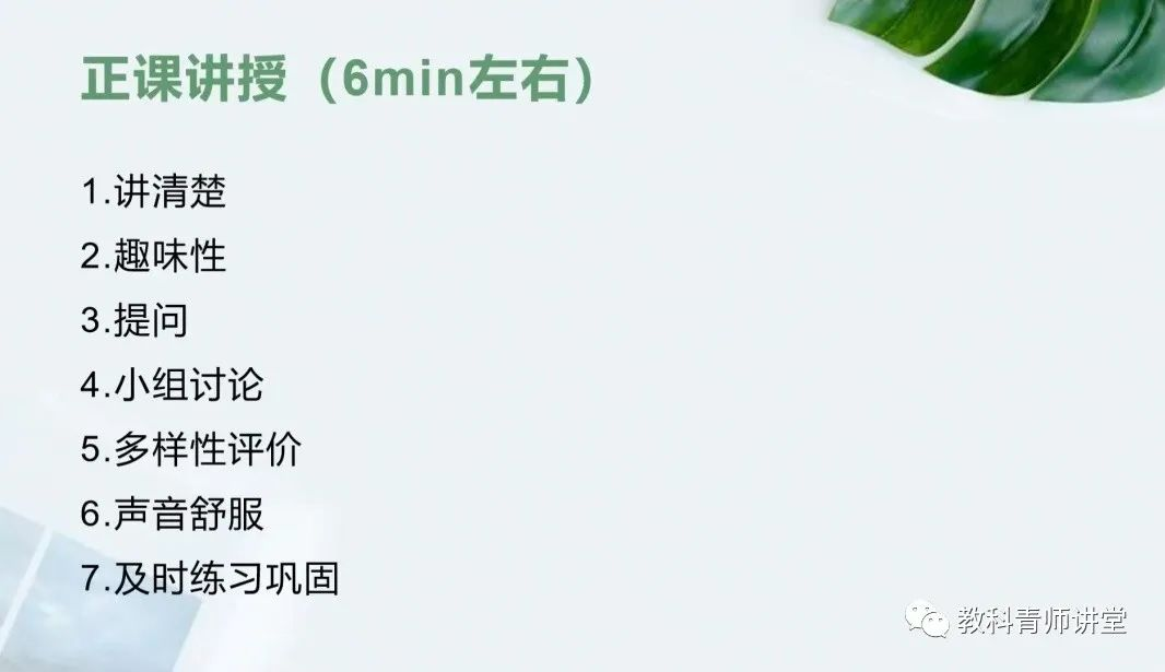 正课的讲授要做到图中所示七点:要把课程内容讲清楚,讲课时要条理清晰。其次,语言要充满趣味性,在准备课件时,可以适当插入一些小视频,来抓住学生的注意力。