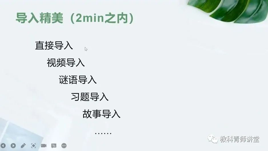 课程的导入要精湛,十分钟的课程中导入至多占两分钟;不喧宾夺主,起到引出本节课主题的作用。