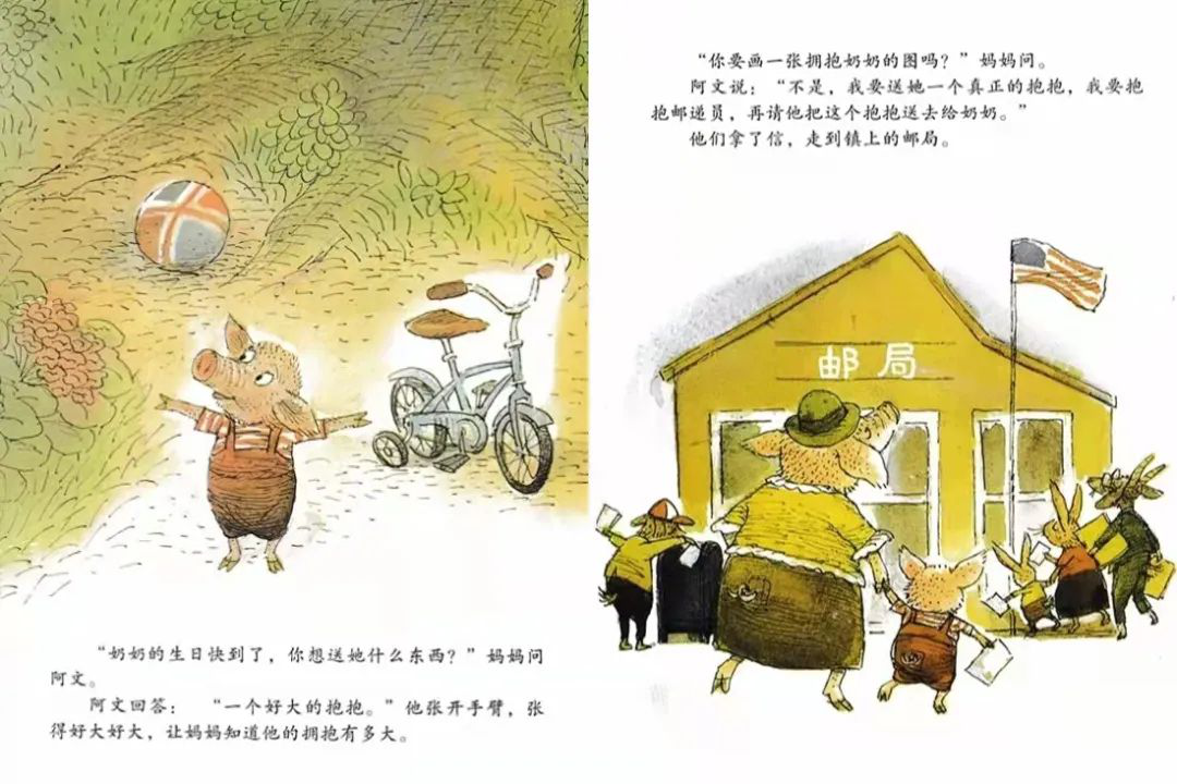 小猪阿文突发奇想,想送一个“很大的抱抱”作为特别的生日礼物送给千里之外的奶奶。他和妈妈来到邮局,告诉工作人员倪先生说:“我要寄一个大大的拥抱给我的奶奶”,在妈妈帮助阿文写完奶奶家的地址后,小猪阿文给了倪先生一个大大的拥抱,并嘱咐说:“你把抱抱给邮差的时候,就要像这个抱抱一样大哦!” 然后,借着“抱抱”这份特殊邮件的传递,每个环节的邮差都拥抱了彼此。终于当“抱抱”寄到了奶奶家,奶奶很高兴,决定让邮差再寄一份特殊的礼物给阿文,这个同样特殊的礼物会是什么呢?在抱抱传递的过程中,邮差之间又发生了什么故事呢?