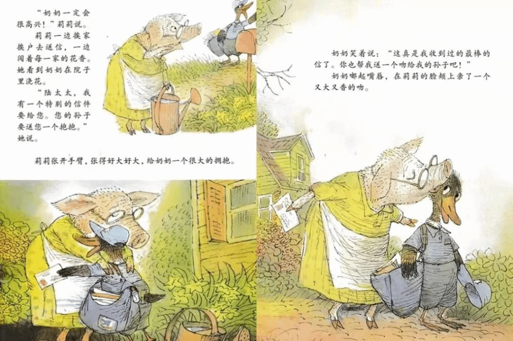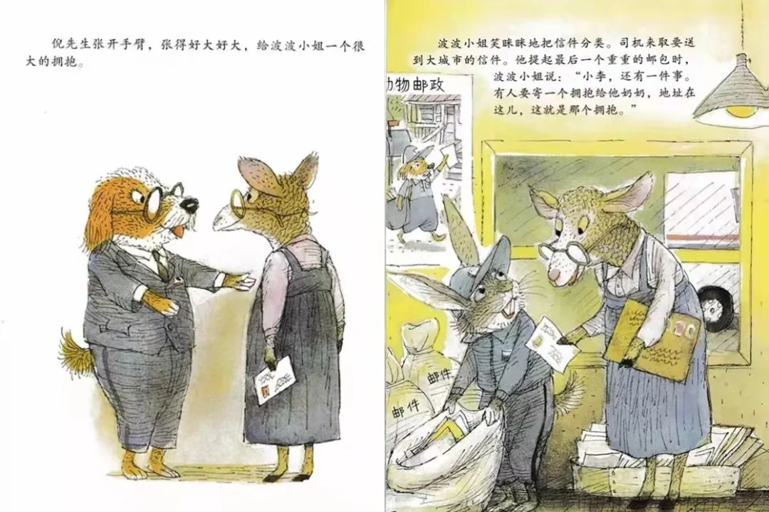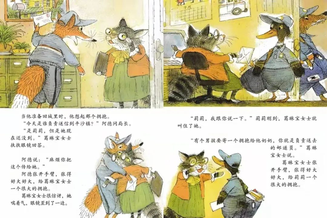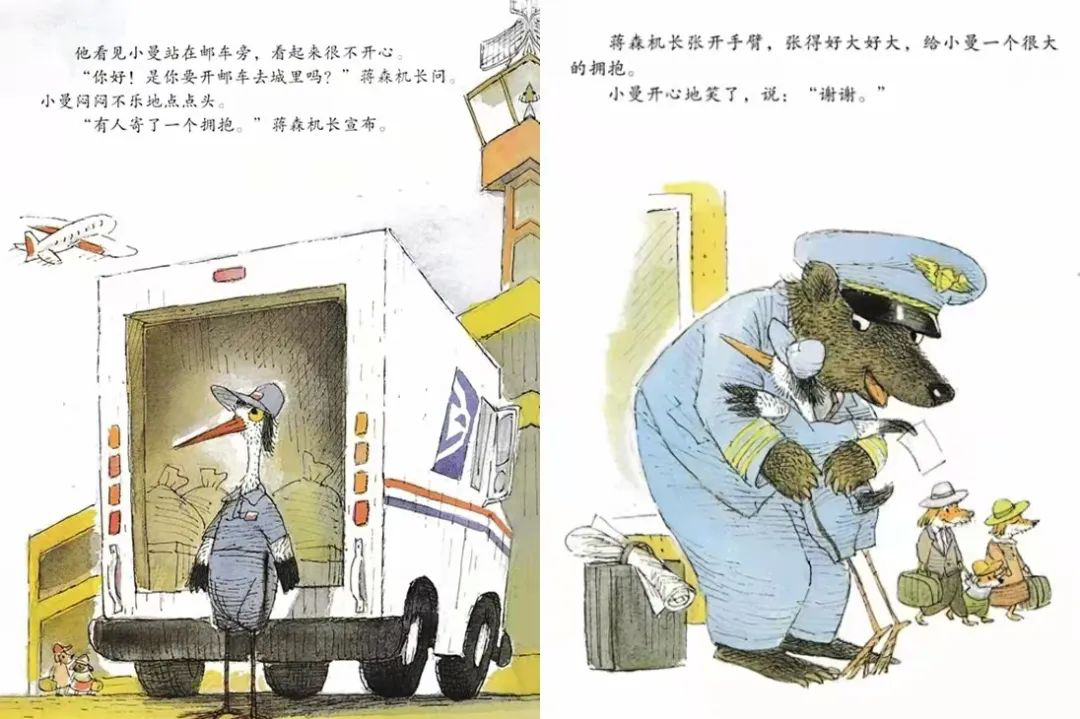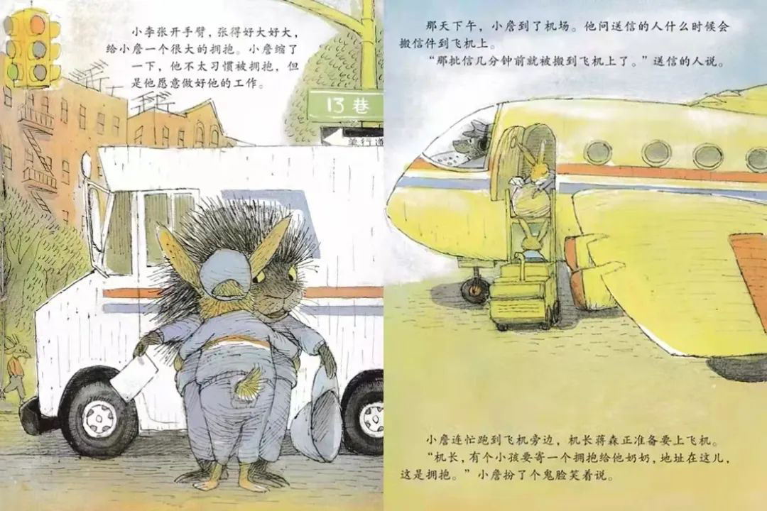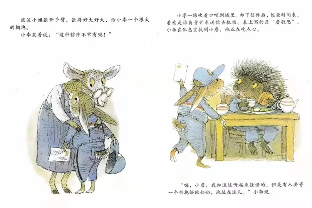 《会飞的抱抱》利用“邮寄拥抱”的过程,把人们遗忘已久的人情味,一个一个重拾回来。这种人与人之间简单的互动,却充满了创意与暖度,结局中的小小猪脸上的亲亲创意,令人莞尔。故事中的动物造型多变,有的大、有的小、有的甚至身上长满尖刺,更为传递拥抱的过程增加几分波折和趣味。搭配俏皮、活泼的文字叙述,大人、孩子都适合阅读,尽情享受这种甜蜜与幸福。