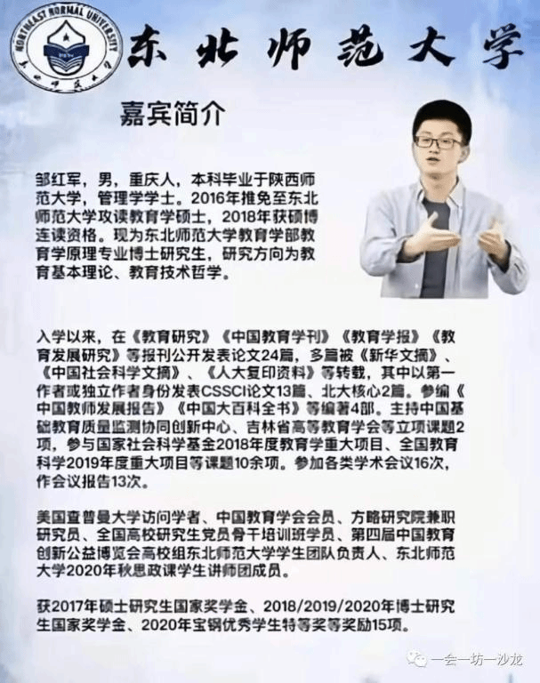 本次活动有幸请到了十分优秀的特邀嘉宾——邹红军。邹红军老师,本科毕业于陕西师范大学,2016年推免至东北师范大学攻读教育学硕士,2018年获硕博连读资格。现为东北师范大学教育学部教育学原理专业博士研究生,研究方向为教育基本理论、教育技术哲学。在《教育研究》《教育学报》等报刊公开发表论文24篇,其中以第一作者或独立作者身份发表CSSCI论文13篇、北大核心2篇。主持中国基础教育质量监测协同创新中心、吉林省高等教育学会等立项课题2项。