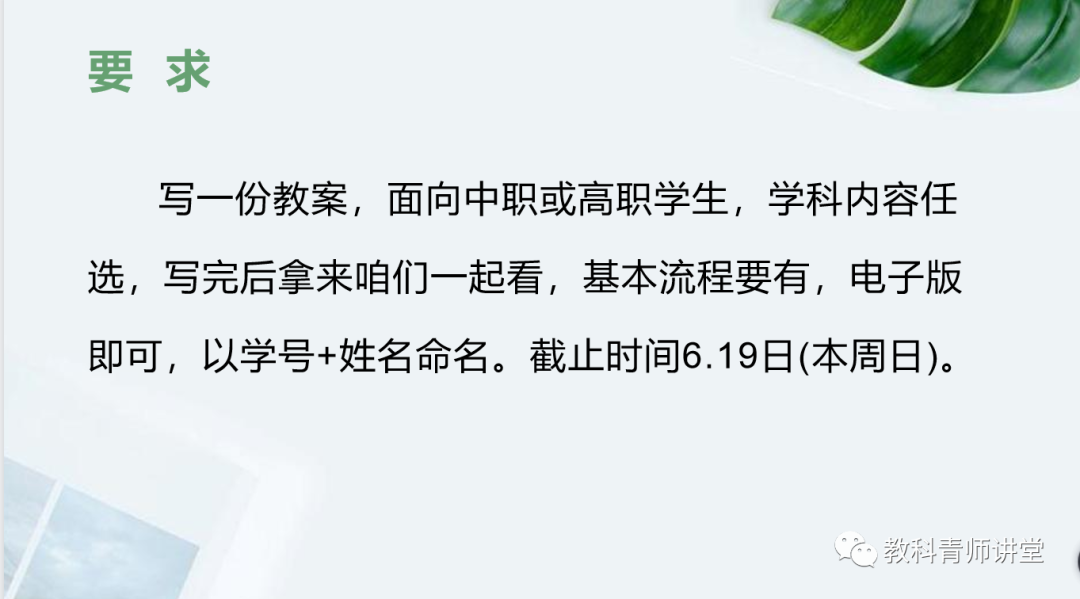 本堂课结束之时,高新老师给青师讲堂的小伙伴们布置了这样的活动要求:通过本堂课的学习写出一份教案。面向中职或高职院校的学生,对他们所学的内容进行针对性的教案设计。