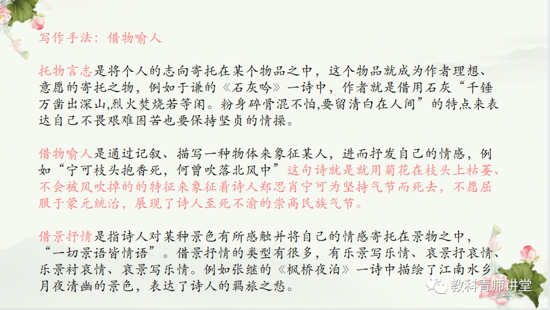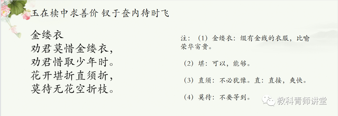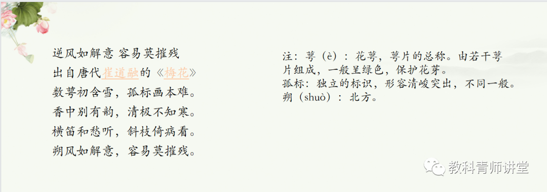 在导入新课之后,引入的诗包括:唐代崔道融的《梅花》,以及宋朝郑思肖的《寒菊》,还有劝人珍惜当下韶华、脍炙人口的诗篇《金缕衣》。