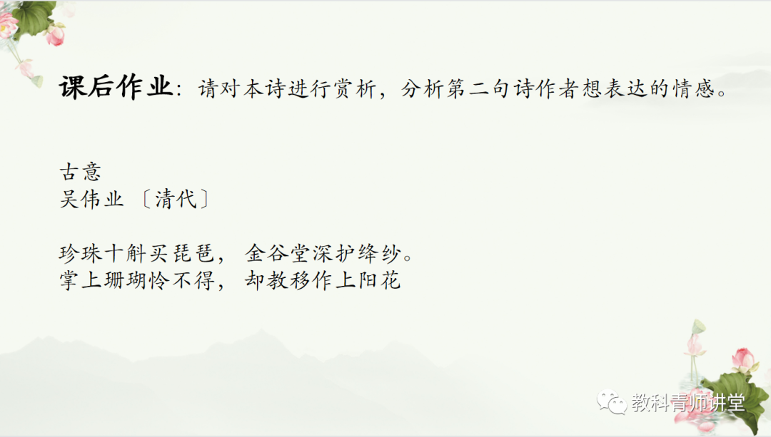 本堂课的作业是要求学习者对于本节课所学诗词熟读成诵,对于课堂后半段所讲的古诗《古意》联系注释以及讲解进行独立的赏析与思考。
