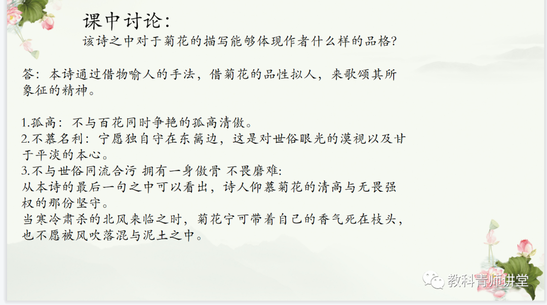 在讲解《寒菊》之时,梁鑫宇同学提出了这样一个问题:“这首诗中菊花的意象能够体现出怎样的人物性格?”引发同学们进行讨论。